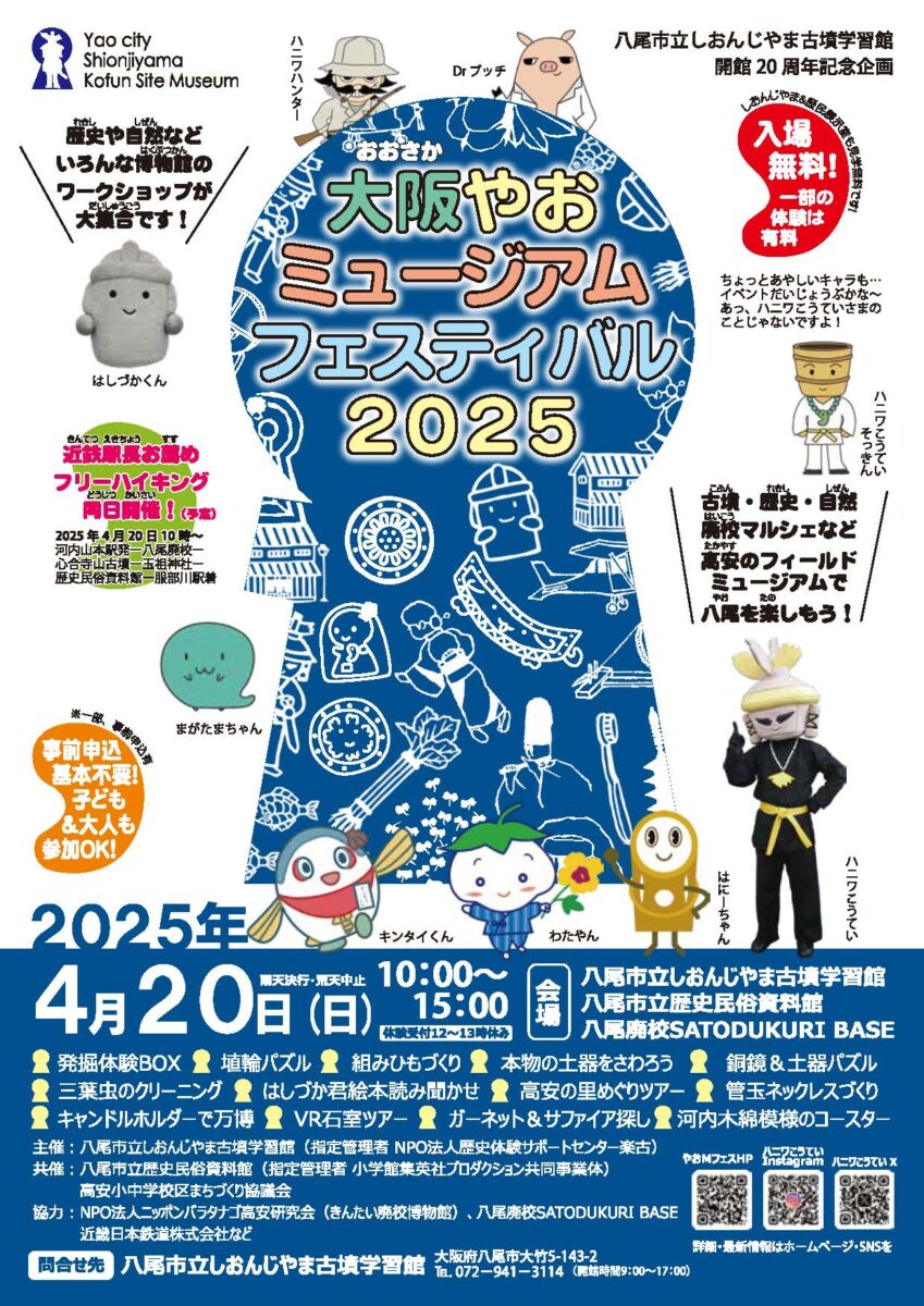 2025年4 月20日(日)に、「八尾市立しおんじやま古墳学習館」の開館20周年を記念して「大阪やおミュージアムフェスティバル2025」が開催されます。